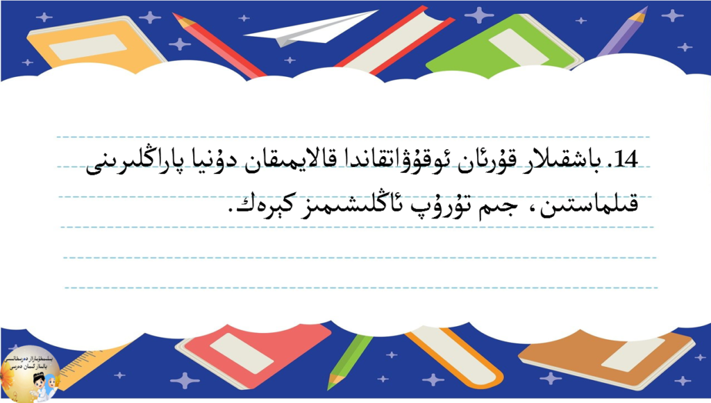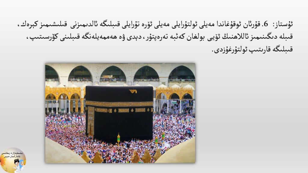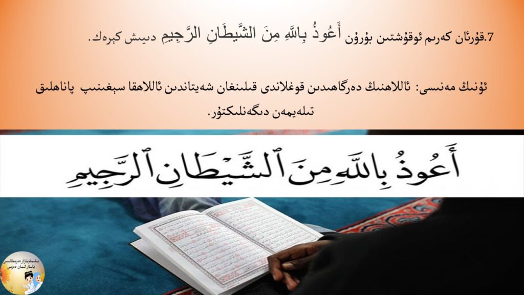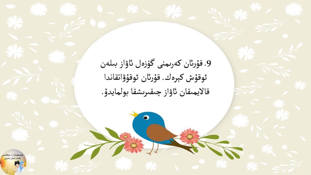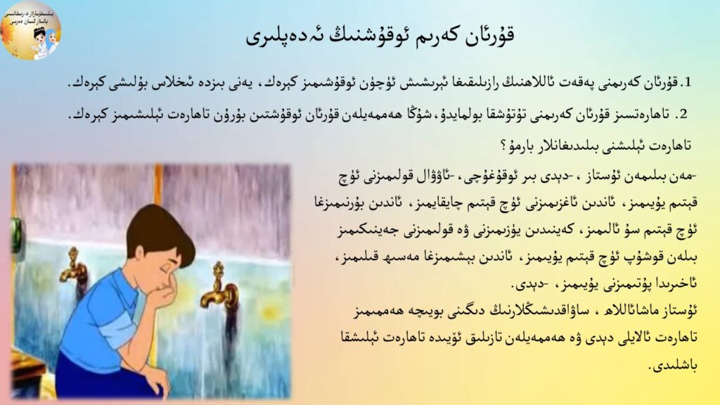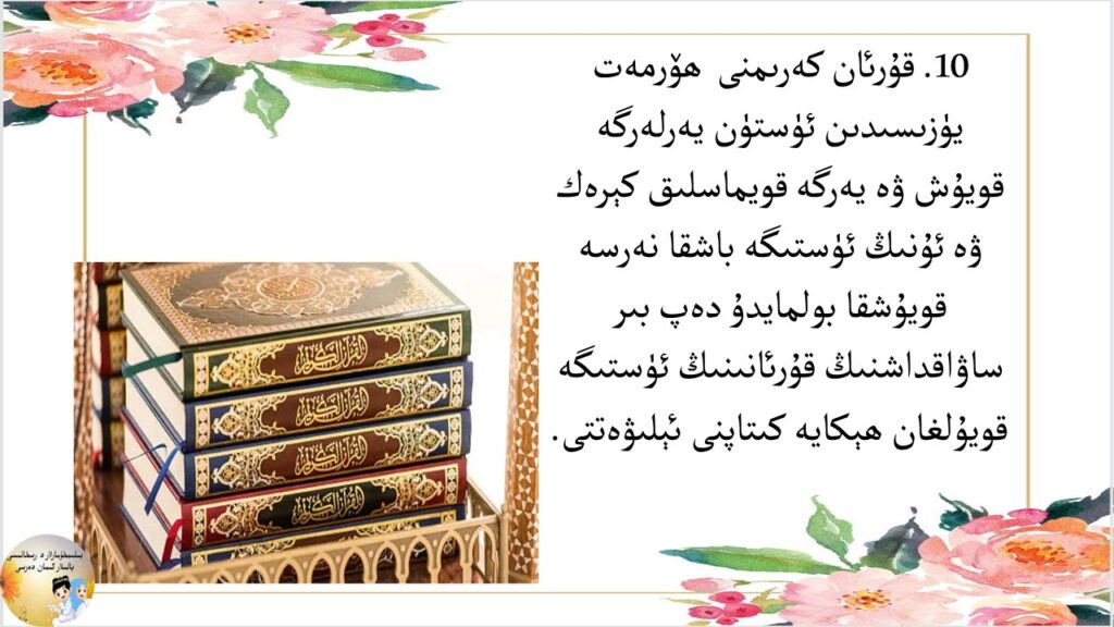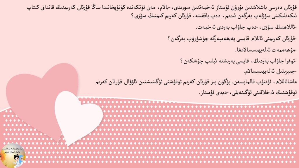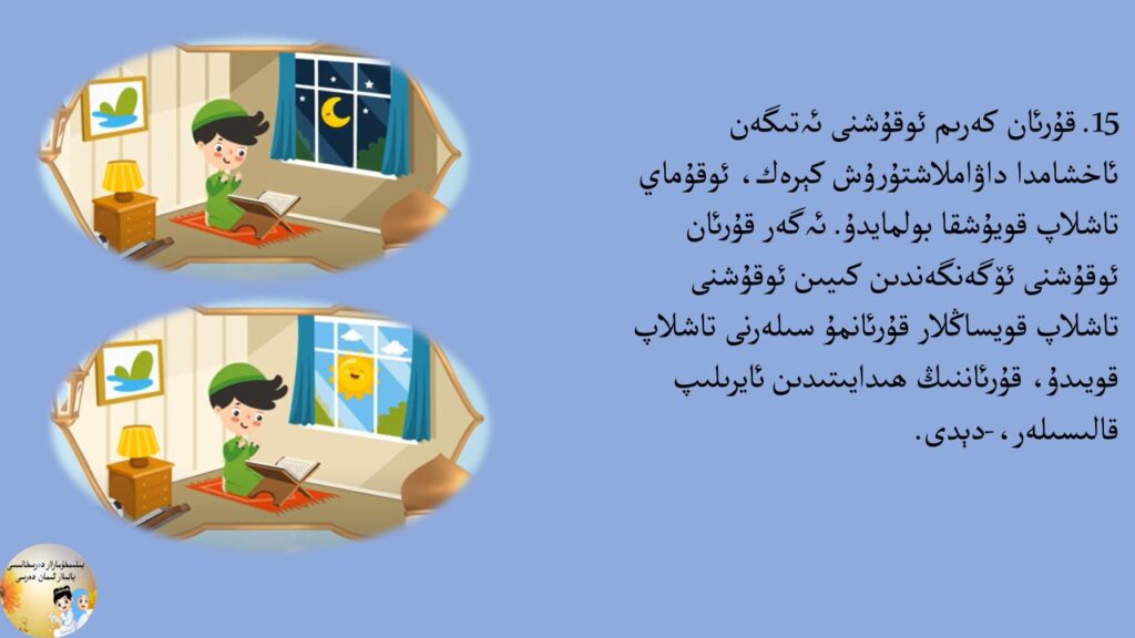 ئالتىنجى دەرس: ئەخمەتنىڭ تۇنجى قۇرئان دەرسى(قۇرئان ئوقۇشنىڭ ئەدەپلىرى) دەرس مەزمۇنى By bilimhumar20/09/202420/09/2024باش بەت, بالىلار ئىمان دەرسى 10 ياشتىن كىچىكلەر ئۈچۈن